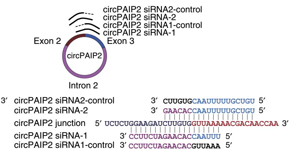1. 外显子环化circRNA,针对反向剪接位点(backsplice junction)序列设计siRNA;