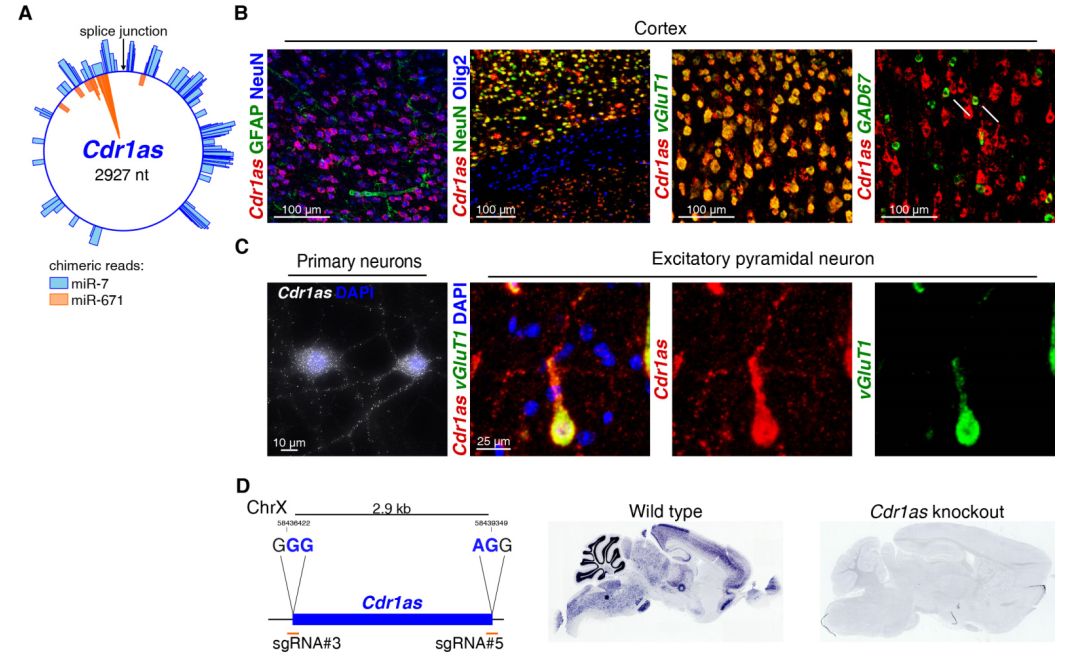 图片引自:Piwecka M, Glažar P, Hernandez-Miranda L R, et al. Loss of a mammalian circular RNA locus causes miRNA deregulation and affects brain function[J]. Science, 2017, 357(6357): eaam8526.
