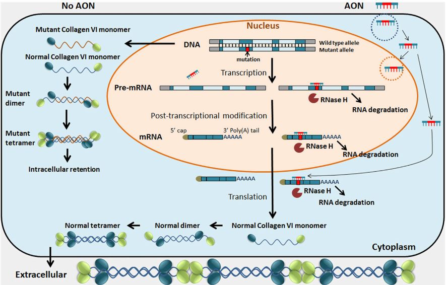 图片引自:Marrosu E, Ala P, Muntoni F, et al. Gapmer antisense oligonucleotides suppress the mutant allele of COL6A3 and restore functional protein in Ullrich muscular dystrophy[J]. Molecular Therapy-Nucleic Acids, 2017, 8: 416-427