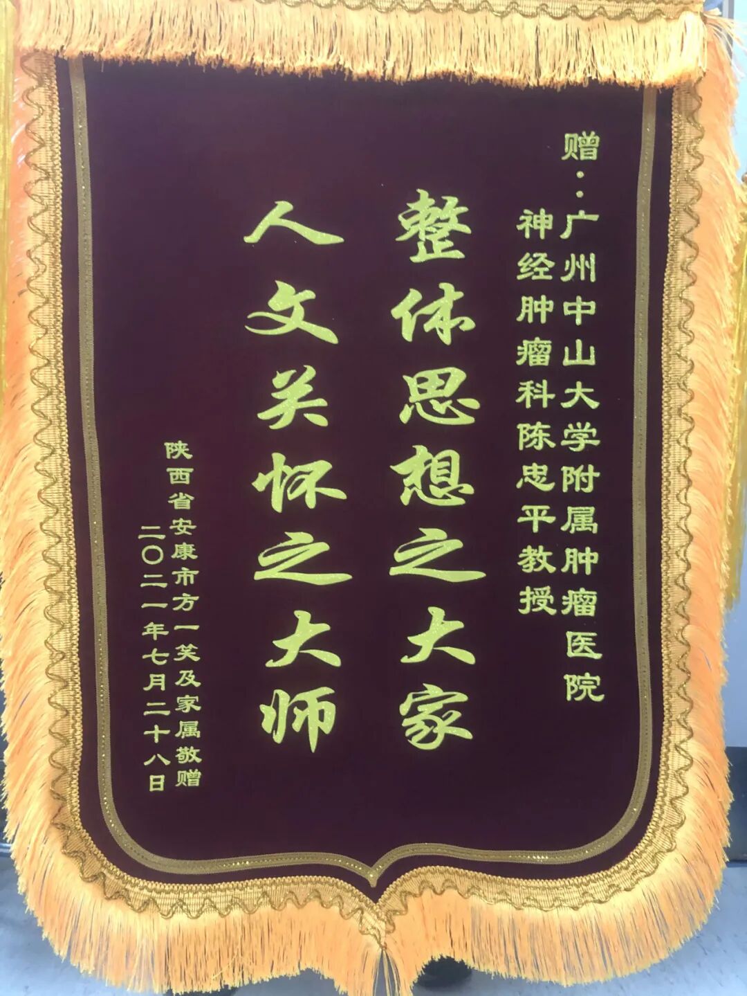 昨天,我特意飞到广州,挂了一个专家号,不是为了看病,而是为了给中山大学肿瘤防治中心的陈忠平教授送一面锦旗,感谢您救了我们一家。